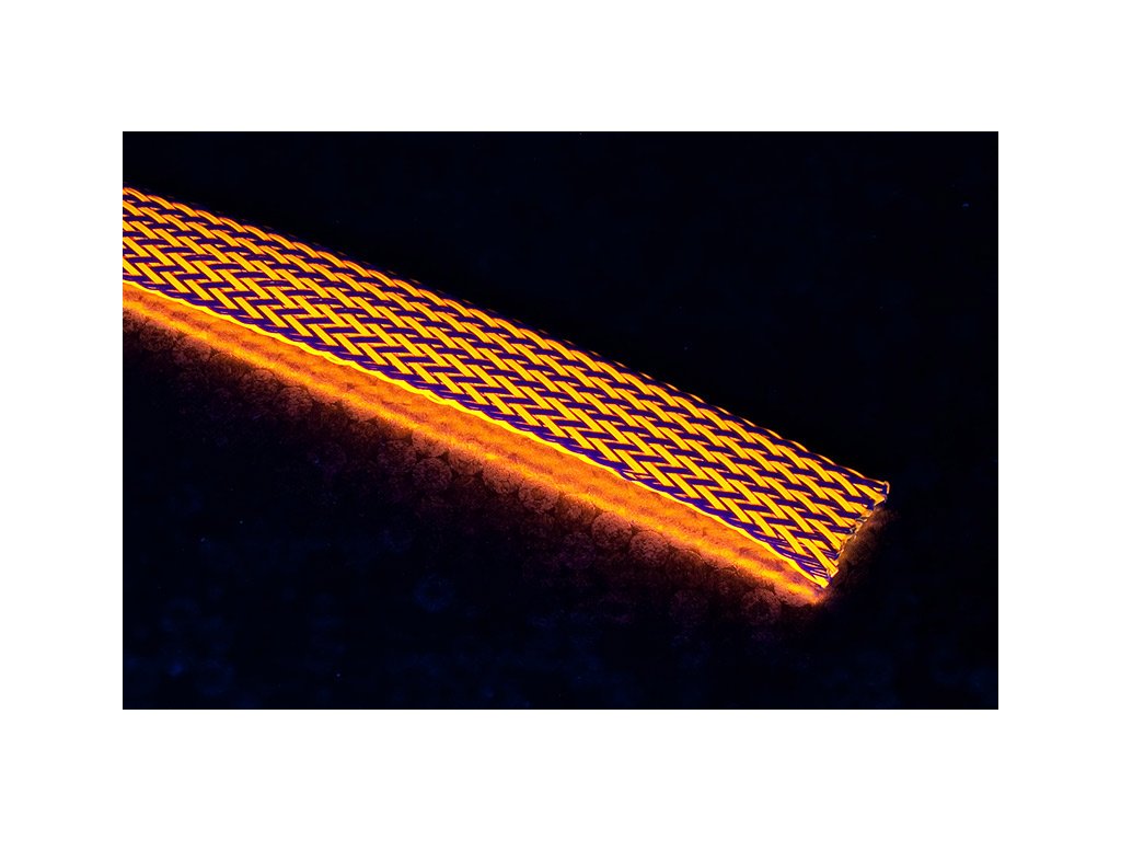 Ide o 12,7 mm rukáv v mimoriadne účinnej dvojfarebnej úprave, pri ktorej sú červené a modré vlákna tkané spoločne. Táto kombinácia je obzvlášť pútavá pod UV svetlom, pretože červené vlákna žiaria oranžovo, zatiaľ čo modré vlákna zostávajú tmavé, čím vytvárajú exkluzívny kontrast.