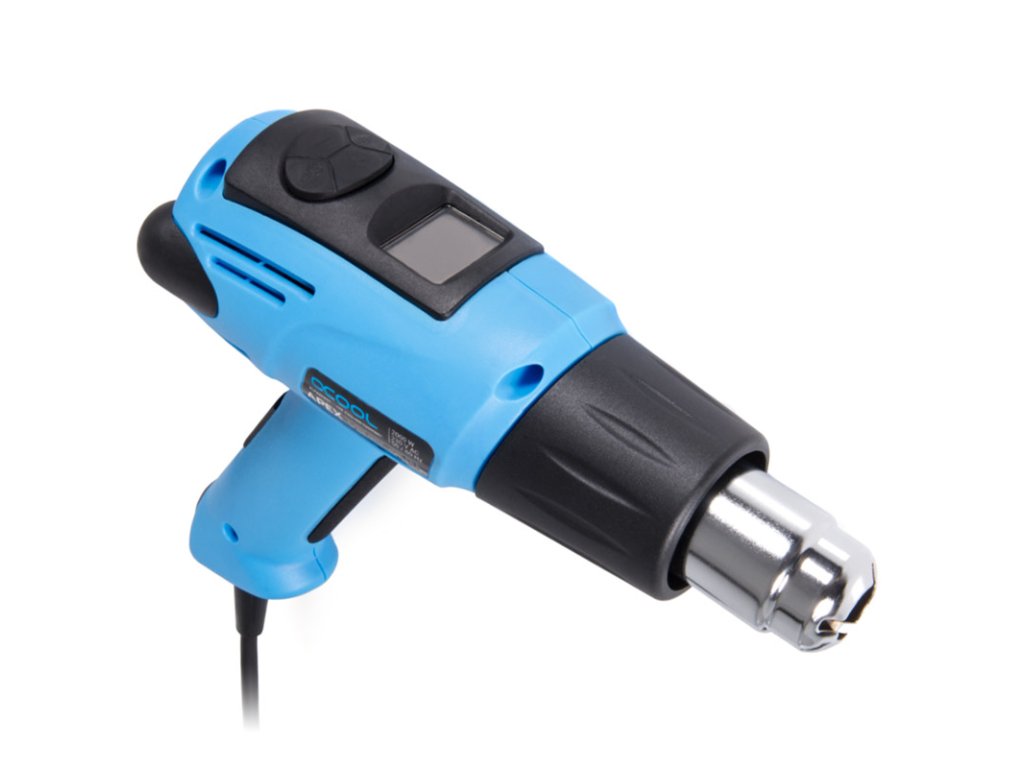 Teplovzdušná pištoľ Apex od spoločnosti Alphacool je praktická a funkčne bohatá teplovzdušná pištoľ pre úpravcov a nadšencov vodného chladenia. Tri gumové nožičky na zadnej strane zaisťujú bezpečný stojan a umožňujú vám pracovať voľne oboma rukami.Integrovaný displej neustále zobrazuje nastavenú teplotu a prietok vzduchu. Pomocou ovládacích prvkov na hornej strane môžete nastaviť presné požadované hodnoty. Súčasťou dodávky sú tri rôzne trysky, ktoré možno meniť v závislosti od použitia. To zaručuje optimálne výsledky.