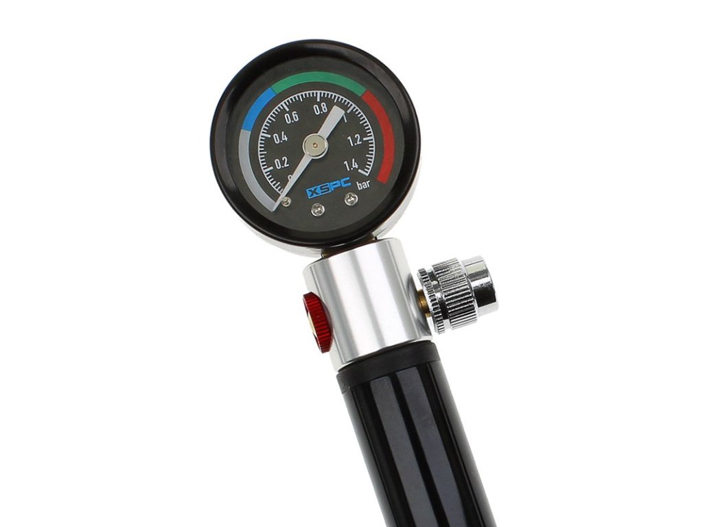 Tlakový tester sa pripojí k novovybudovanému chladiacemu okruhu cez existujúci vnútorný závit G1/4" pomocou praktickej 40 cm pripojovacej hadice a natlakuje sa pomocou priloženého vzduchového čerpadla. Potom nechajte váš systém stáť 15-30 minút. Ak tlak po tomto čase klesol, váš systém vodného chladenia je netesný.V takom prípade skontrolujte obvyklé podozrenia, ako napríklad: Uvoľnené príslušenstvo. Postup musíte opakovať, kým nedôjde k ďalšiemu poklesu tlaku - len tak sú vaše komponenty v bezpečí pred hrozbou poškodenia kvapaliny.