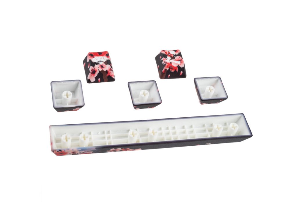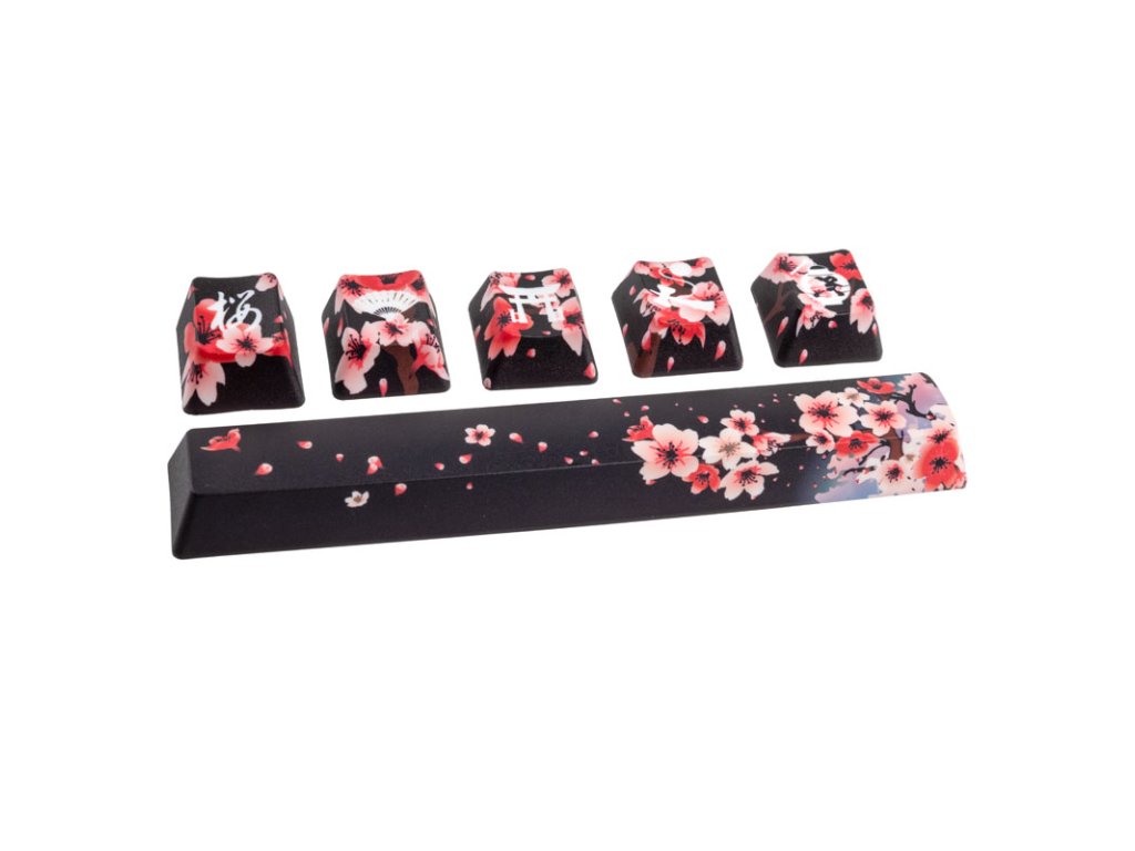 Čerešne v Japonsku kvitnú na jar jemnou ružovou farbou. Týchto šesť krytiek na klávesy PBT je venovaných japonským čerešňovým kvetom s motívom "Sakura". Dodajte svojej mechanickej klávesnici nádych kúzla Ďalekého východu. Sú vhodné pre spínače Cherry MX, ako aj pre všetky identické spínače klávesov od iných výrobcov.Klapky sú vyrobené z čierneho PBT, mimoriadne odolného polokryštalického plastu. Ich označenie a dizajnový motív boli do plastu zapracované z piatich strán pomocou procesu dye-sub, čo znamená, že sú prakticky neovplyvniteľné odieraním. Vďaka tomu sú tieto klávesnice zZradcovia mimoriadne odolné. Označenie na klávesoch nie je priesvitné.