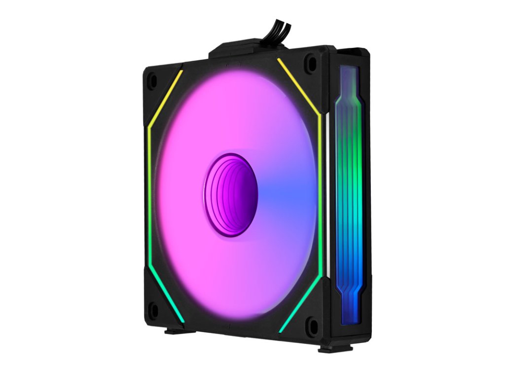 VLian Li UNI FAN SL-INF 120 Reverzná čepeľ celkovo sedieť40 digitálne adresovateľných RGB LED diód. Sú rozmiestnené na náboji rotora a dvoch tenkých pásikoch v hliníkovom ráme. Na prednej strane náboja a na dvoch stranách sú tiežNekonečné zrkadlo ktoré jedinečným spôsobom zvýrazňujú svetelné efekty.