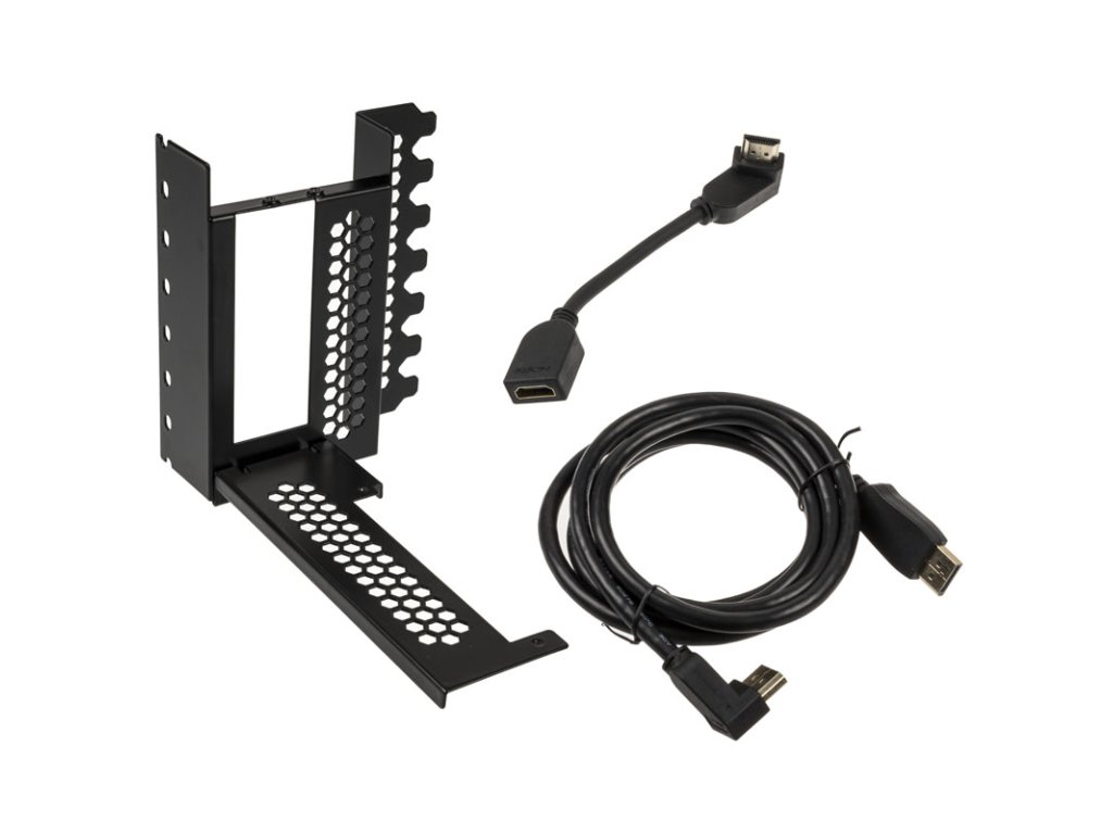 S čiernouvertikálny držiak grafickej karty od spoločnosti CableMod pozostávajúci zo stúpacieho kábla PCIe a špeciálneho držiaka slotu PCI, možno použiť na vytvorenieVertikálna grafická karta vo všetkých štandardných vežových puzdrách je možné nainštalovať. Kryt slotu adaptéra je pripevnený ku krytom slotov krytu a je kompatibilný so všetkými krytmi s otvoreným dizajnom slotov PCI s najmenej siedmimi voľnými slotmi. Grafická karta sa posunie približne o 3,1 cm ďalej do krytu.Kábel riser spája grafickú kartu so slotom PCIe základnej dosky. Jeho slot x16 je elektricky prepojený s plnými 16 dátovými linkami, a preto poskytuje plnú šírku pásma pre grafické karty. Na prenos údajov slúžiflexibilný páskový kábel. Okrem tohosilne uhlový kábel DisplayPort a adaptér HDMI s.