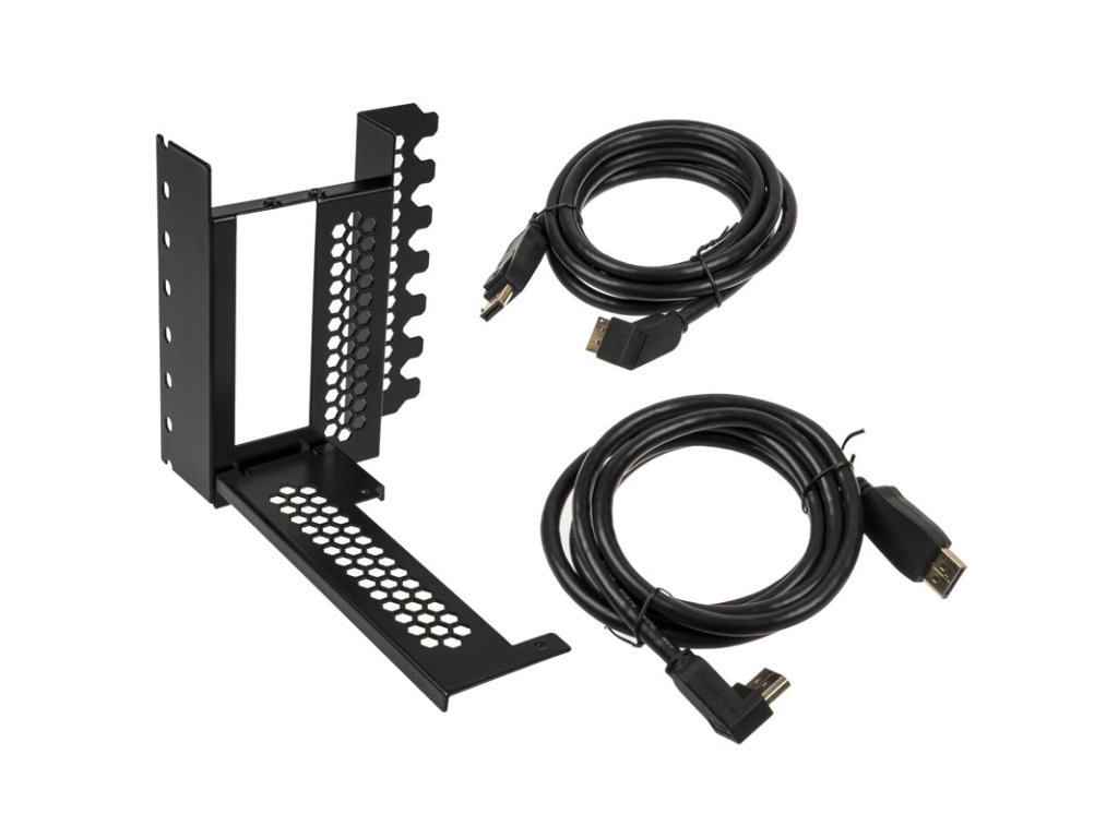 S čiernouvertikálny držiak grafickej karty od spoločnosti CableMod pozostávajúci zo stúpacieho kábla PCIe a špeciálneho držiaka slotu PCI, možno použiť na vytvorenieVertikálna grafická karta vo všetkých štandardných vežových puzdrách je možné nainštalovať. Kryt slotu adaptéra je pripevnený ku krytom slotov krytu a je kompatibilný so všetkými krytmi s otvoreným dizajnom slotov PCI s najmenej siedmimi voľnými slotmi. Grafická karta sa posunie približne o 3,1 cm ďalej do krytu.Kábel riser spája grafickú kartu so slotom PCIe základnej dosky. Jeho slot x16 je elektricky prepojený s plnými 16 dátovými linkami, a preto poskytuje plnú šírku pásma pre grafické karty. Na prenos údajov slúžiflexibilný páskový kábel. Okrem tohodva silne sklonené káble DisplayPort s.