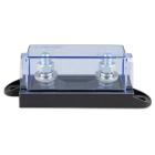 Victron držák pro pojistky MEGA-fuseDržák pojistek o maximálních proudech 60–500 A (32 V) nebo 125–300 A (58 V). Snímatelná krytka. Pojistky se v držáku připevňují na dvojici šroubů M8. Určeno pro připevnění na zeď nebo jiný pevný podklad. Standardně se umísťuje mezi akumulátor a odběrné zařízení (např. měnič/nabíječka MultiPlus, Quattro atd.)