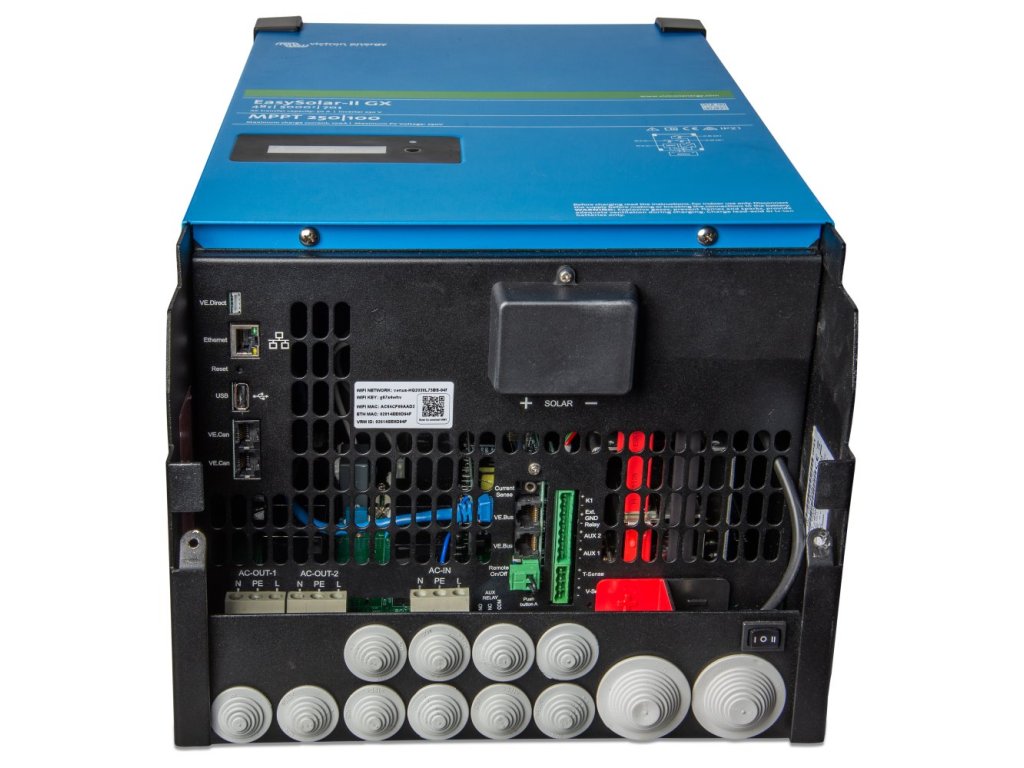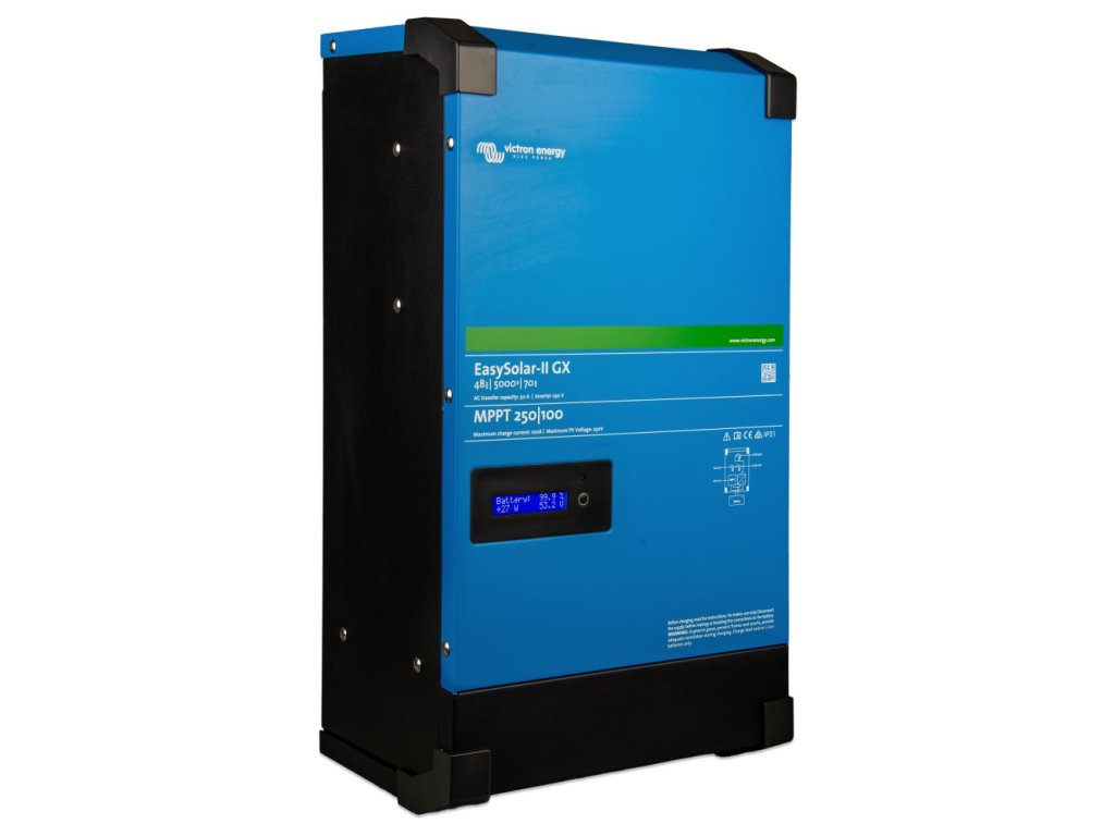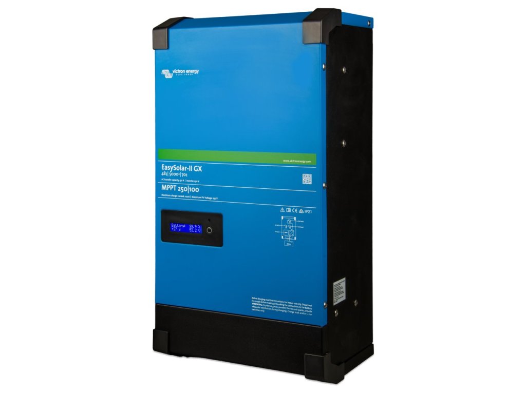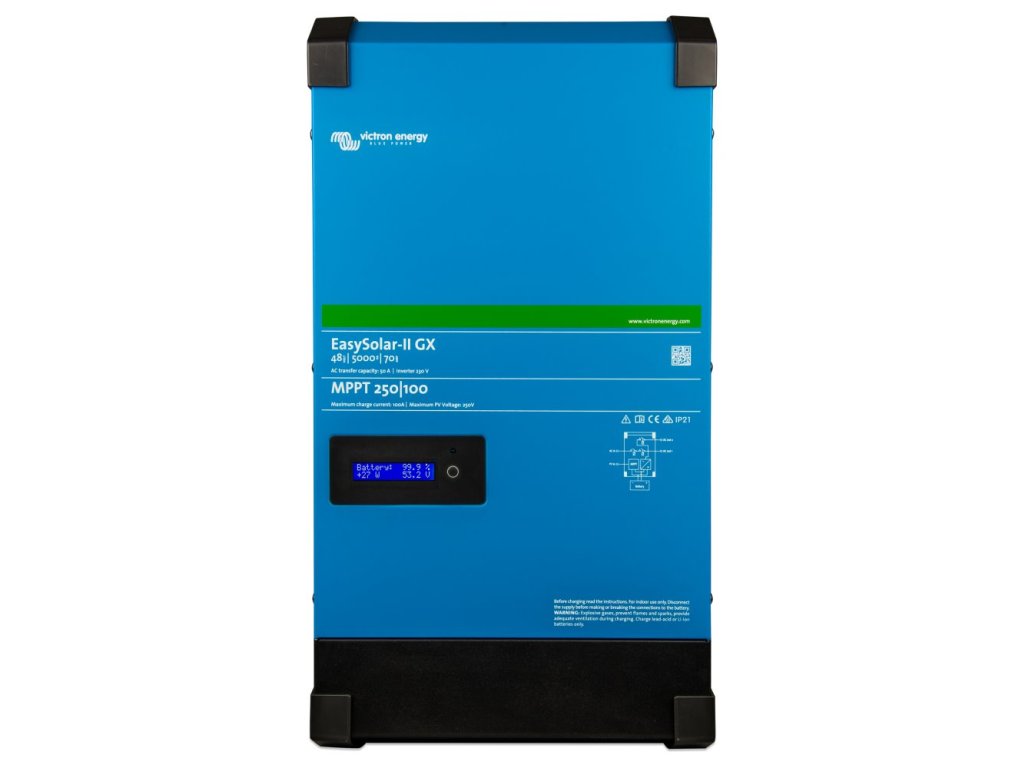 Victron EasySolar-II 48/5000/70-50 MPPT 250/100 GXKomplexní řešení pro ostrovní nebo hybridní solární systém. K jednotce připojíme solární panely, baterii, spotřebiče, elektrocentrálu nebo rozvodnou síť a máme profesionální 1f hybridní/ostrovní systém (5000 VA, 4000 W měnič, 48 V baterie, FV max. 5800 Wp).