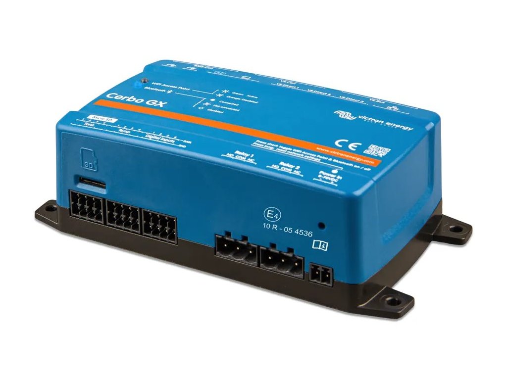 Napájecí napětí: DC 8-70 VRozhraní: Wi-Fi, Bluetooth, 1× RJ-45, 3× VE.Direct, 1× HDMI, 3× USB, 2× VE.Bus, 2× VE.Can, 2× BMS-Can, 12× I/O port, 2× relé, 1× microSD slot