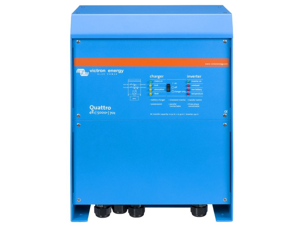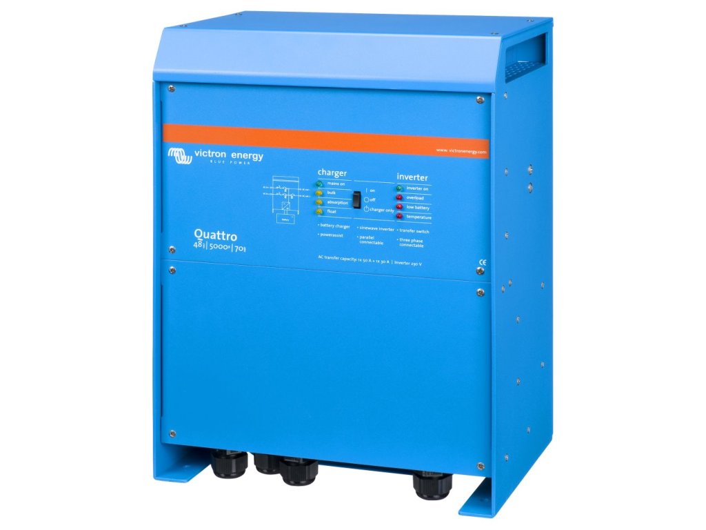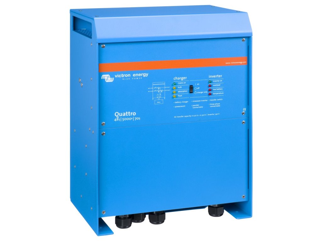 Victron Quattro 48 V (5000 VA)Quattro je sofistikovaná AC-DC nabíječka akumulátorů a DC-AC střídač (invertor) s dvěma AC vstupy, čistě sinusovým výstupním napětím a ultra rychlým přepínačem mezi sítí (generátorem) a akumulátory.