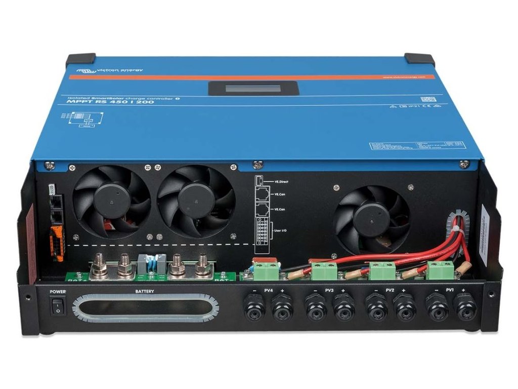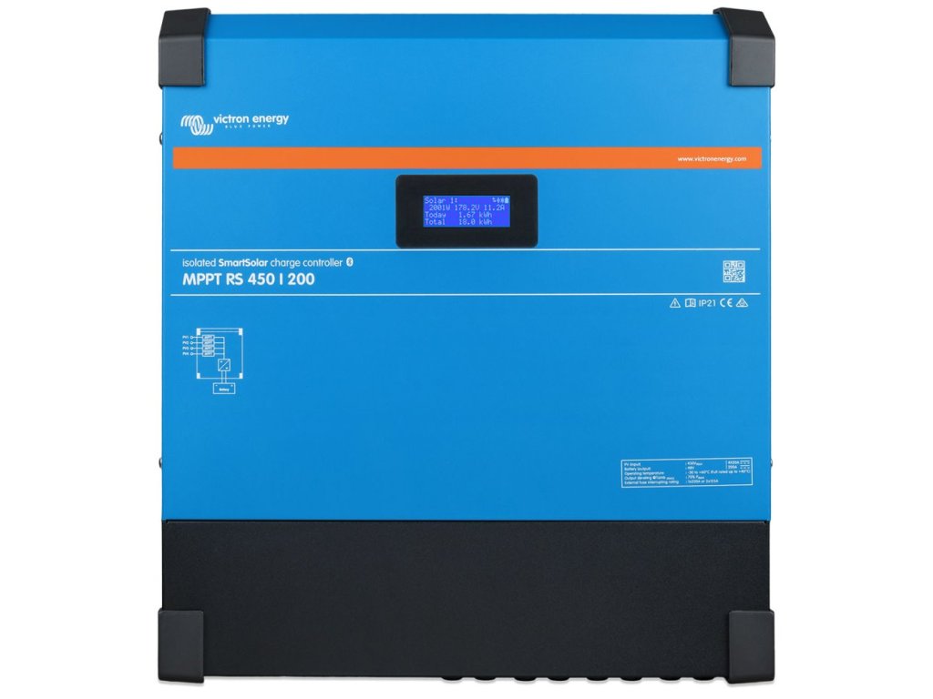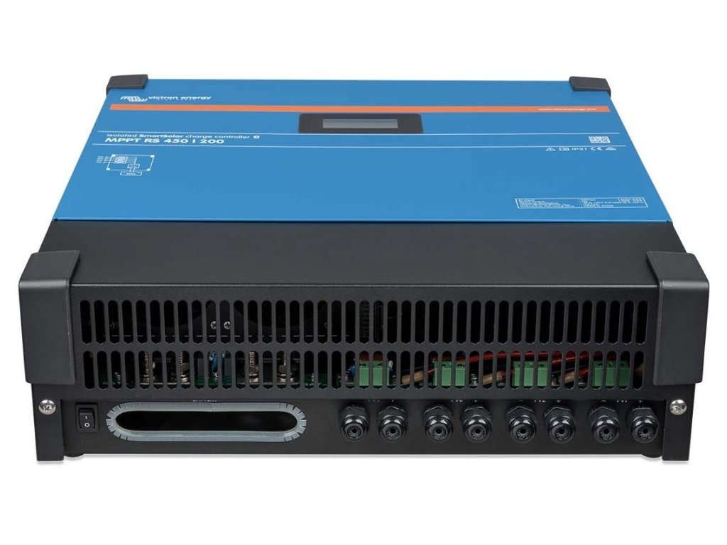 Solární regulátory SmartSolar MPPT RS 450 V (200 A) jsou řešením pro systémy s větším množstvím do série zapojených FV panelů nabíjejících 48 V baterie. Tento produkt je ideální pro velké ostrovní systémy, ale i pro systémy připojené k distribuční síti.