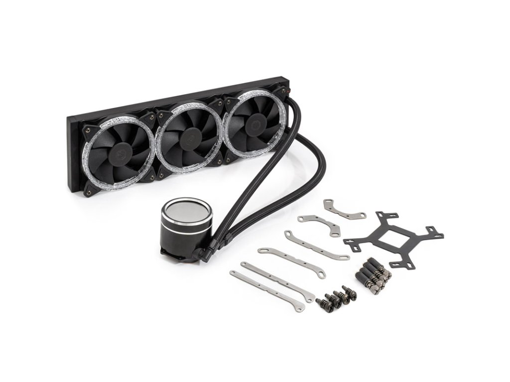 S 360 mm radiátorom máte ideálnu pozíciu, pokiaľ ide o chladenie moderných procesorov. Je vyrobený z medi a ponúkaveľmi dobrý odvod tepla. Správny prietok vzduchu zabezpečujú tri 120 mmNotos Xtal Ventilátor. Vďaka maximálnej rýchlosti 1 800 otáčok za minútu a cielenému prúdeniu vzduchu pre ne odpadové teplo z procesora nepredstavuje žiadny problém. Ako špeciálna funkcia sú oba ventilátory vybavené vencami vKrištáľový vzhľad priložené. Integrované osvetlenie RGB sa tu tiež stará o nádherné zobrazenie farieb. Na ovládanie osvetlenia je tiež potrebný 3-pinový konektor s priradením 5VDG na každý ventilátor na základnej doske alebo ovládač.