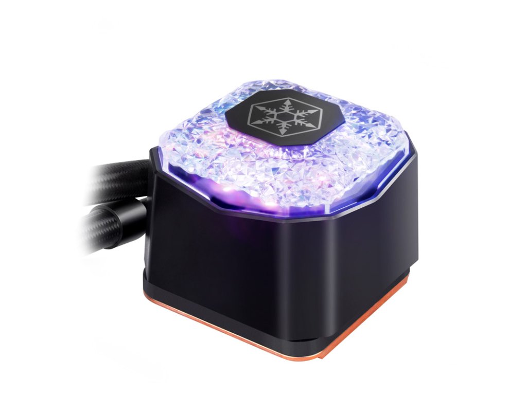 SIceGem 360 ponukySilverStone jedenKompletné vodné chladenie ktorý ponúka dobrú rovnováhu medzi veľkosťou a chladiacim výkonom vďaka 360 mm radiátoru. Chladiaci blok CPU s medenou základnou doskou je vhodný pre štandardné sockety AMD a Intel. Odvádza teplo od procesora rýchlo a efektívne. Samotný chladič je vyrobený z hliníka a je vybavený tromi ventilátormi.Tri120 mm ventilátor PWM so zabudovaným osvetlením RGB LED sú už súčasťou dodávky. Pri maximálnych 2 200 otáčkach za minútu prenášajú až158,69 m³/h a vytvárajú statický tlak3,18 mmH2O. Výsledná hladina hluku je obmedzená na maximálne 36,6 dB(A). Motor čerpadla pracuje s trojfázovou, šesťpólovou konštrukciou pre plynulú prevádzku systému.