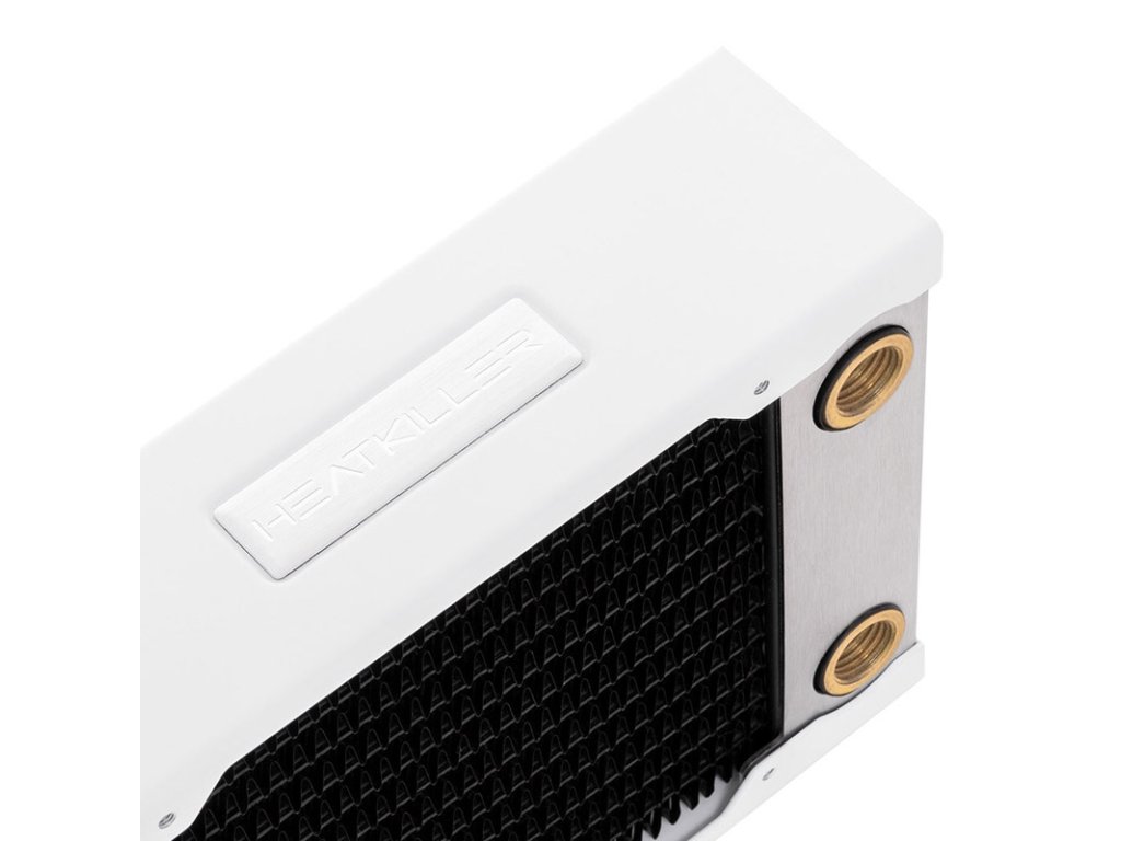 StránkaHeatkiller RAD vyrobené takmer výlučne z medi. Iba predkomôrky sú vyrobené z mosadze. V nich sú integrované dva vstupy a výstupy v univerzálnom štandarde so závitom G1/4 palca.