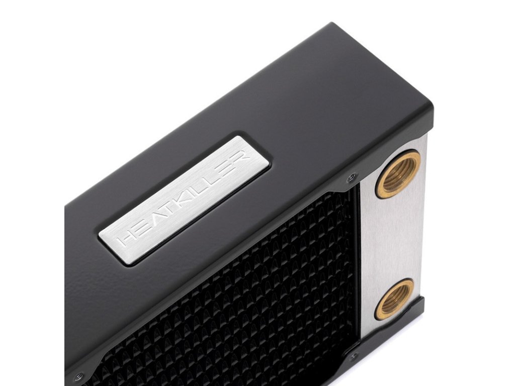 StránkaHeatkiller RAD vyrobené takmer výlučne z medi. Iba predkomôrky sú vyrobené z mosadze. V nich sú integrované dva vstupy a výstupy v univerzálnom štandarde so závitom G1/4 palca.