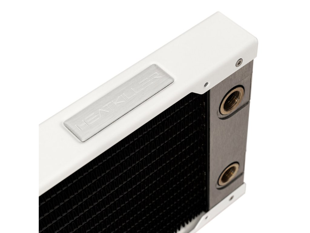 StránkaHeatkiller RAD vyrobené takmer výlučne z medi. Iba predkomôrky sú vyrobené z mosadze. V nich sú integrované dva vstupy a výstupy v univerzálnom štandarde so závitom G1/4 palca.