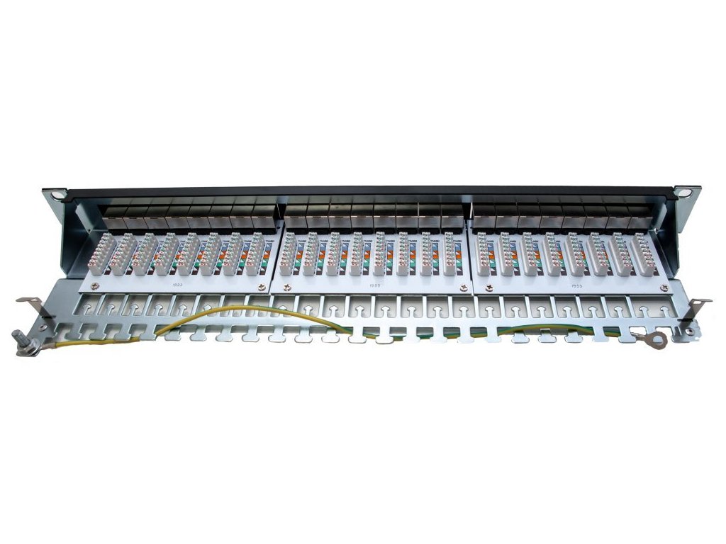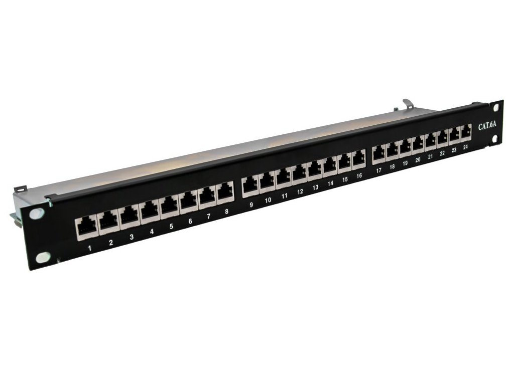 XtendLan XL-PP19-24C6AS-XL-BLACKPropojovací patch panel osazený 24 porty kategorie Cat6a pro narážecí kontakty typu LSA a jeden PCB. Kontakty jsou pozlacené a na svorkovnici odlišené barvami podle typu zapojení, a to buď podle T568A, T568B nebo číselně značeny. Součástí těla panelu je vyvazovací lišta a zadní pravoúhlé vedení kabelů pro jejich pevné připevnění. Životnost zářezů je min. 200 použití a jsou určeny pro vodiče AWG 22-26. Zařízení splňuje normu TIA/EIA 568B.2-10 kategorie 6A.