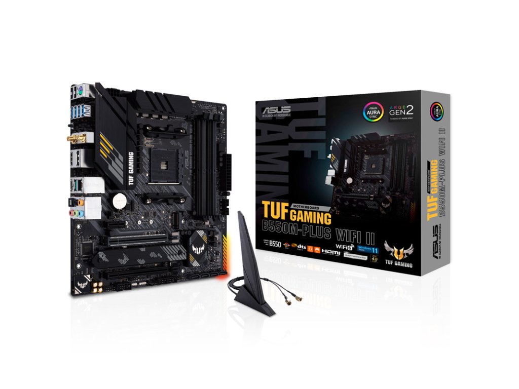 StránkaASUS TUF Gaming B550M-PLUS Wi-Fi II je základná doska ATX s čipovou sadou AMD B550 a socketom AM4. Základná doska je vhodná pre desktopové procesory AMD Ryzen radu 5000 a 3000, ako aj radu 4000 G a podporuje PCIe 4.0. Podporuje pamäť DDR4 s frekvenciou až 4 866 MHz. Základná doska je vhodná najmä ako základná doska pre herné počítače a vyplní šasi väčšiny bežných skriniek.Technické údaje: